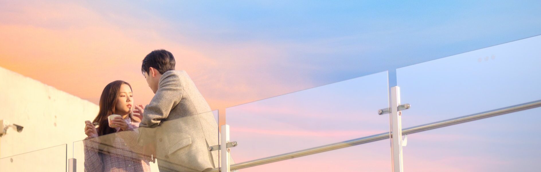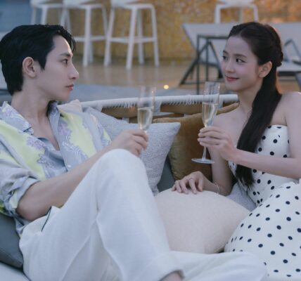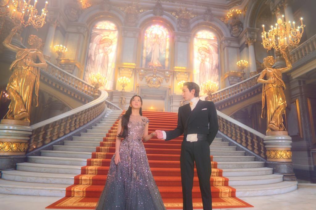 In the newly unveiled stills, Jisoo radiates elegance and charm. One breathtaking image shows her walking down a grand staircase in a glittering gown beside Seo In-guk, teasing a fairytale-like romance straight out of a fantasy novel. Another captures a soft rooftop moment at sunset, highlighting the tender chemistry between the two leads. The contrast between opulent fantasy settings and sleek, neon-toned VR environments hints at the drama’s unique concept — a woman testing ideal virtual boyfriends while unknowingly confronting her real feelings.