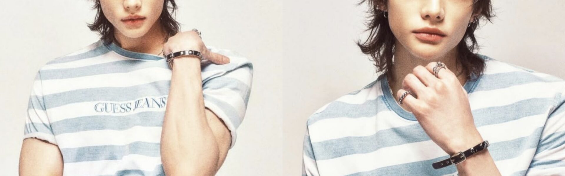 In the campaign visuals, Hyunjin appears in several signature GUESS JEANS outfits, including cropped sweatshirts, classic straight-fit denim jeans, striped T-shirts, jackets, and cargo pants. The styling reflects the brand’s youthful and modern streetwear aesthetic while perfectly highlighting Hyunjin’s unique charm and confident aura. His natural ability to blend music, performance, and fashion makes him a perfect representative for the iconic denim brand.